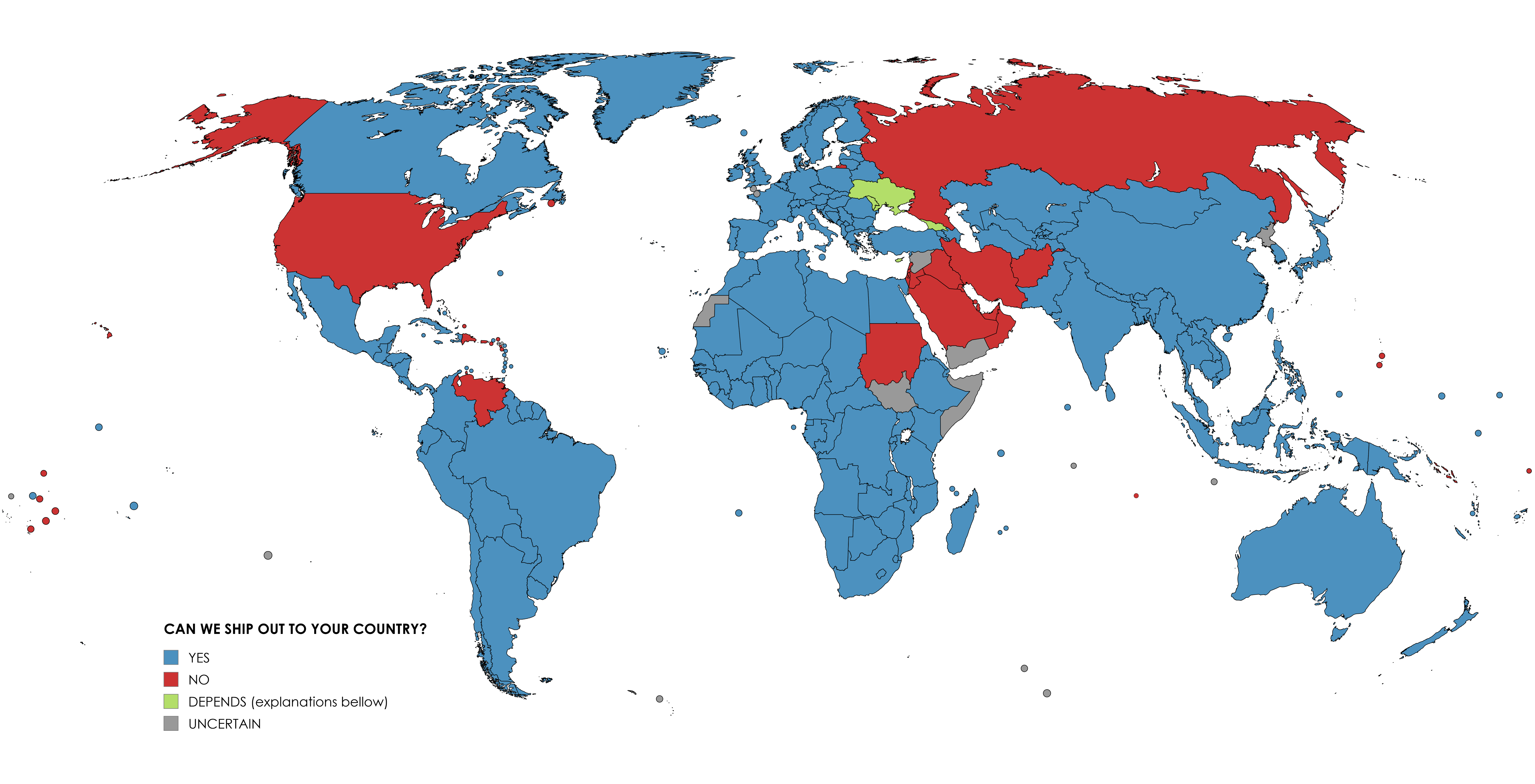 BELOW YOU WILL FIND A MAP THAT DOCUMENTS WHERE WE CAN AND CANNOT SHIP OUT TO. (May differ if item ships from elsewhere)